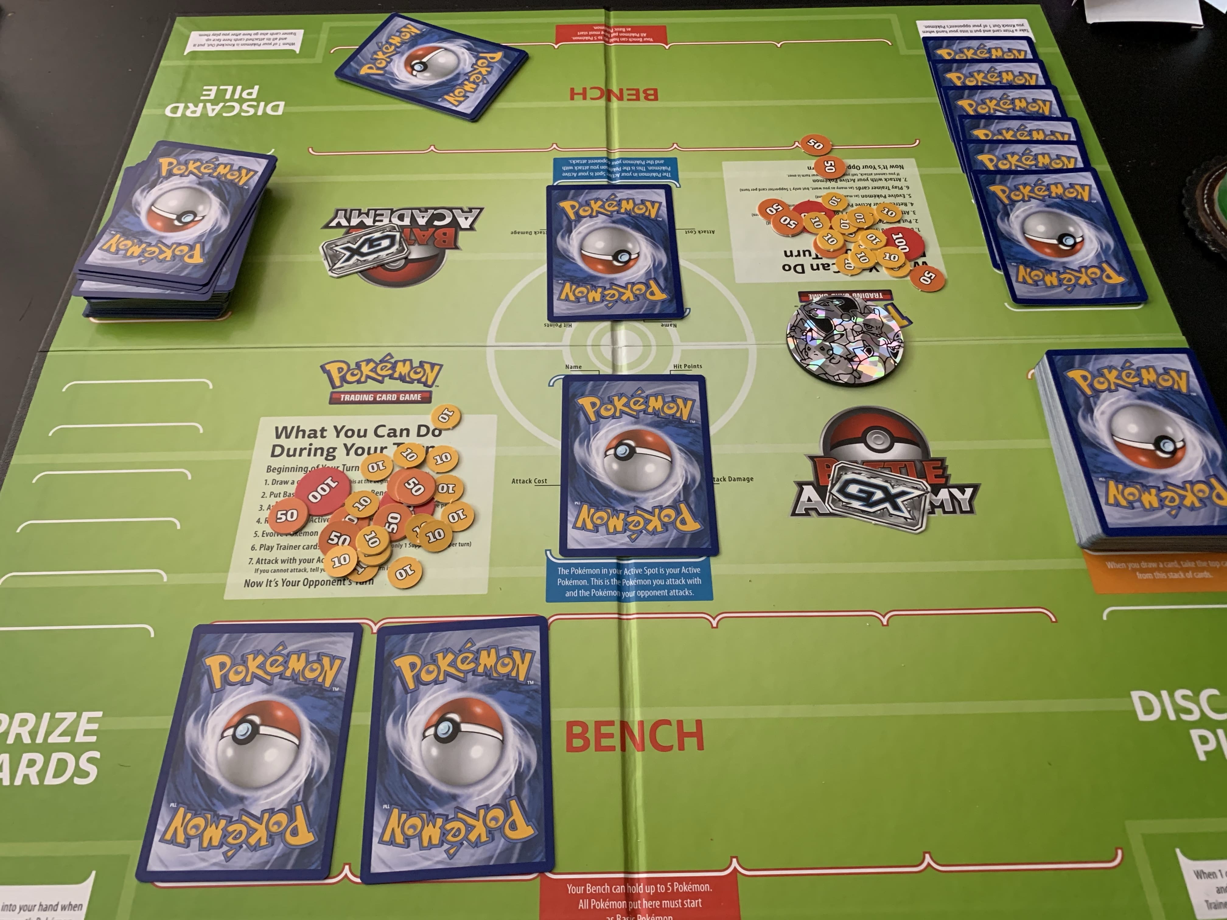 Na hracej ploche je balíček, odhodiská (Discard Pile), aktívny Pokémon, lavička s maximálne 5 Pokémonmi a Karty odmien (Prize Cards). Počas hry sa používajú žetóny na označenie zranení a špeciálnych stavov. Odhodisko je miesto na hracej ploche, kde sa ukladajú všetky karty, vyradené z hry počas priebehu partie. Patria sem vyradení Pokémoni spolu so všetkými kartami, ktoré na nich boli pripojené, napríklad energetické karty, ale aj použité trénerové karty. Každý hráč má vlastný odhodiskový balíček, ktorý je verejne dostupný – hráči si môžu karty v odhodiskách navzájom prezerať, aby vedeli, čo už bolo použité alebo vyradené.