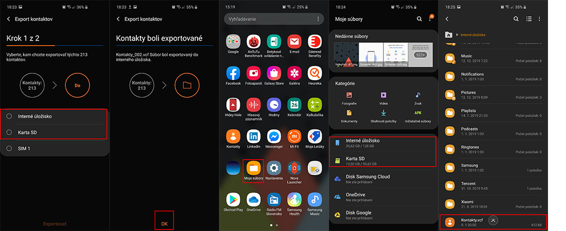 - Kliknete na “Export” a vyberiete si miesto, kam si chcete kontakty uložiť (najlepšie je na interné úložisko alebo SD kartu). Počkáte kým sa vám kontakty exportujú.