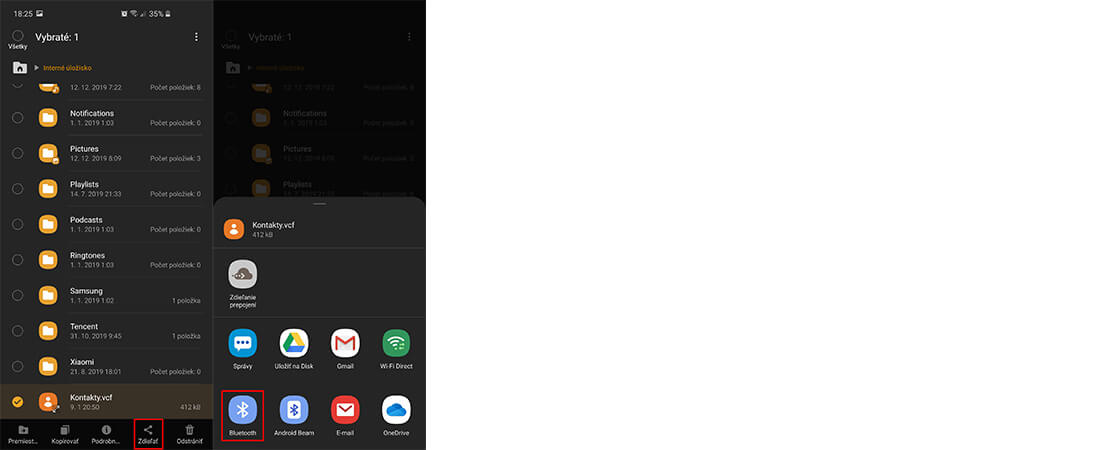- Dlhým podržaním na súbor Kontakty.vcf sa vám zobrazia možnosti, kde si vyberiete možnosť “Zdieľať”. Vyberiete si možnosť ako si pošlete kontakty. Najlepšie ak si označíte možnosť poslať cez “Bluetooth” (máte možnosť odoslania aj cez Gmail alebo na cloudové úložisko Disk).