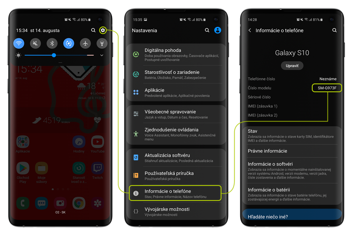 Na domovskej obrazovke zobrazte Notifikačnú lištu tak, že v hornej časti potiahnite prstom smerom nadol. Následne kliknite na maličké zubaté koliesko Nastavenia. Z vyobrazených ponúk scrollujte úplne nakoniec, kým nenájdete Informácie o telefóne. Tu sa môžete dočítať o modeli a type vášho smartfónu.