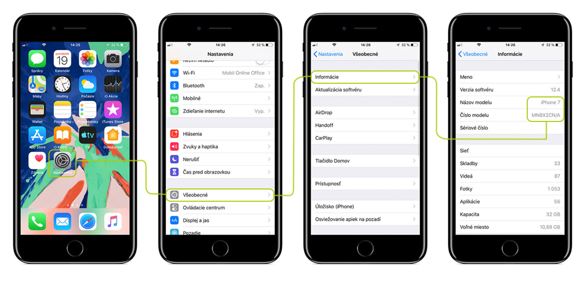 Na domovskej obrazovke nájdite aplikáciu Nastavenia (ikonka kolieska). V ponuke vyberte Všeobecné a následne zvoľte Informácie. Zobrazí sa niekoľko riadkov, vás však bude zaujímať len riadok Model. Tu nájdete označenie svojho iPhonu začínajúce písmenom A (napríklad A1865, A1901 a pod.), ktoré stačí zadať do Google. Následne sa zobrazí model vášho telefónu.